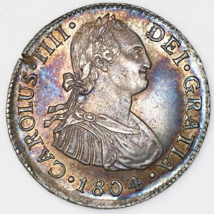 Lima, Peru, bust 2 reales, Charles IV, 1804JP. KM-95; CT-952. 6.55 grams. Gorgeously toned UNC with small planchet flaw in edge at 10 o'clock.