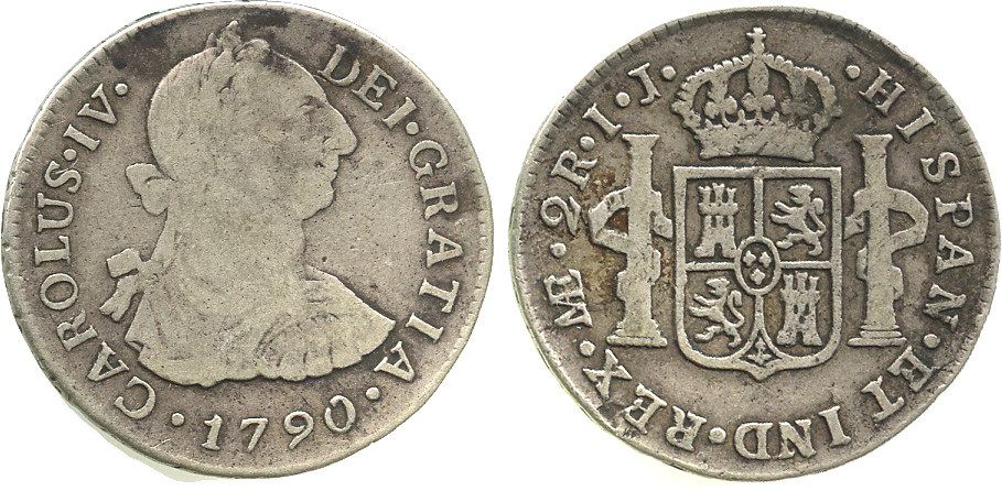 Lima, Peru, bust 2 reales, Charles IV transitional (bust of Charles III, ordinal IV), 1790IJ. CT-932; KM-85.1. 6.5 grams. Fine with bold details due to contrasting toning on fields.