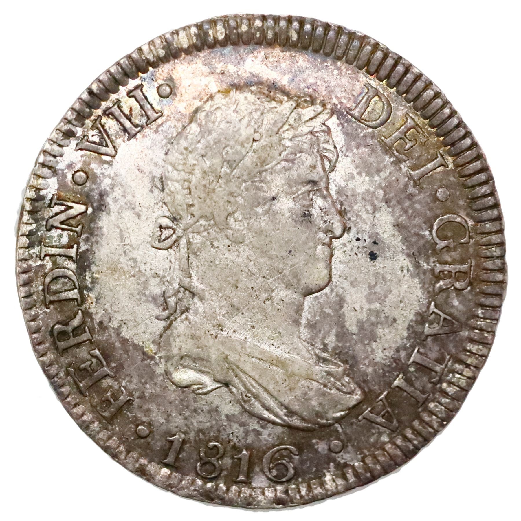 Lima, Peru, bust 2 reales, Ferdinand VII, 1816JP. Cal-816; KM-115.1. 6.58 grams. AU with mottled rainbow toning over original mint luster, light surface hairlines on the obverse.