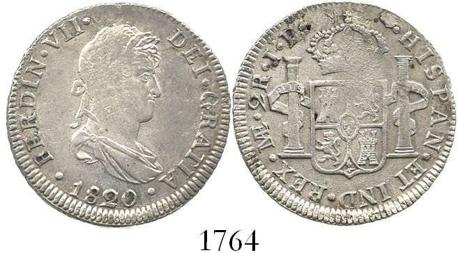 Lima, Peru, bust 2 reales, Ferdinand VII, 1820JP. KM-115.1; CT-908. 6.6 grams. Broad-flan AU with weak centers, lustrous and starting to tone.
