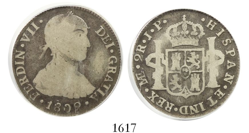 Lima, Peru, bust 2 reales, Ferdinand VII ("imaginary" bust), 1809JP, encapsulated PCGS VG08, rare. KM-104.2; CT-897. Nicely toned, really more like Fine with weak centers, no problems, listed in KM as "rare," without values.