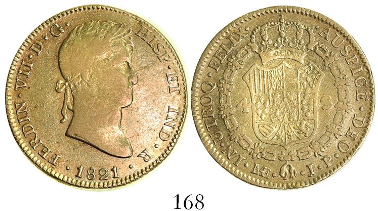Lima, Peru, bust 4 escudos, Ferdinand VII, 1821JP. CT-143; KM-128. 13.28 grams. AVF, even yellow color, no big problems, final year of issue for this denomination.