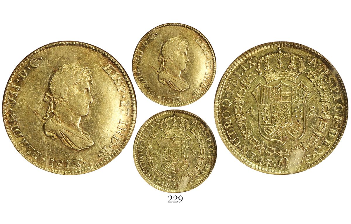 Lima, Peru, bust 4 escudos, Ferdinand VII (small draped bust), 1813JP, encapsulated NGC AU 55, rare. KM-122; CT-135. High luster on reverse and in obverse legend, minor natural flaw behind the bust, which is small per the two-year type (supposedly a 2R punch).