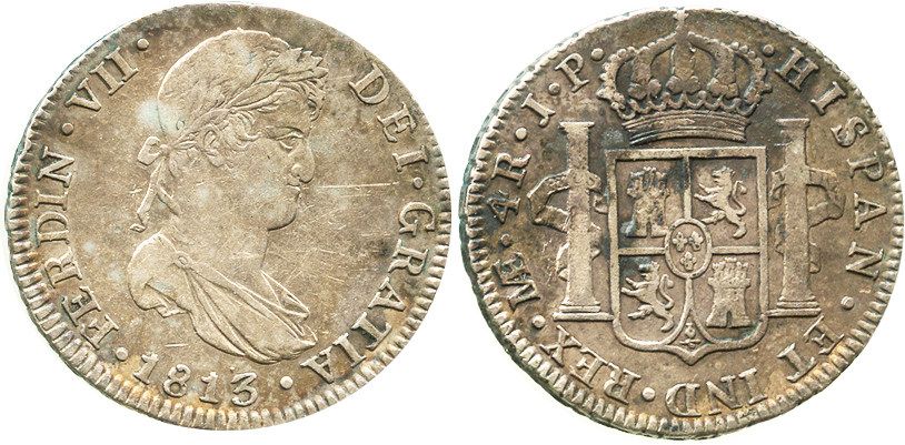 Lima, Peru, bust 4 reales, Ferdinand VII, 1813JP. CT-742; KM-116. 13.3 grams. Toned AXF with hint of luster, slightly crude rims due to poor centering.