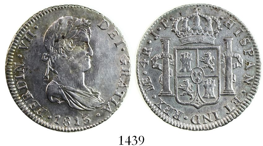 Lima, Peru, bust 4 reales, Ferdinand VII, 1813JP. KM-116; CT-742. 13.45 grams. Bold XF with minor marks in fields, slightly off-center strike, no toning.