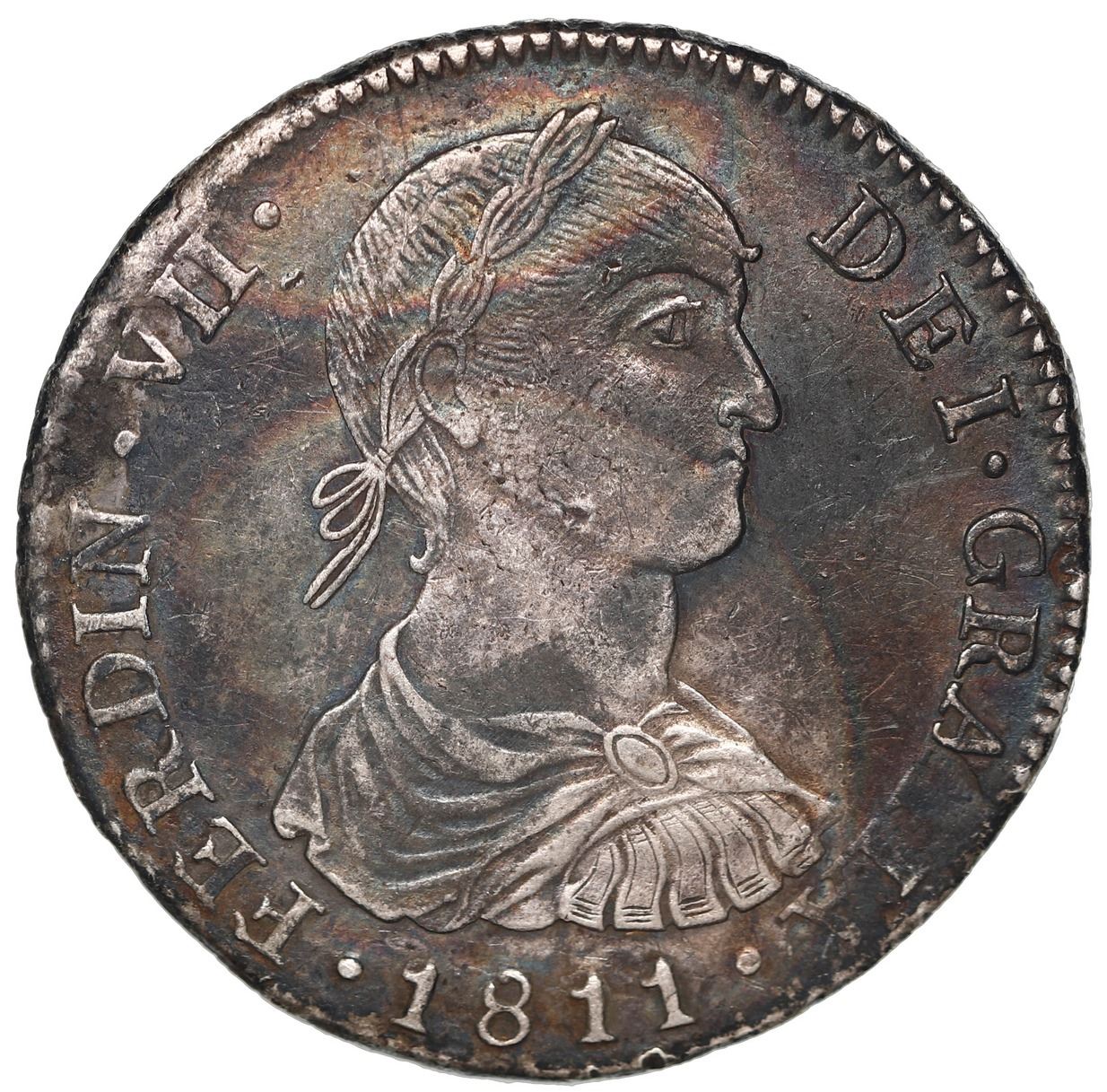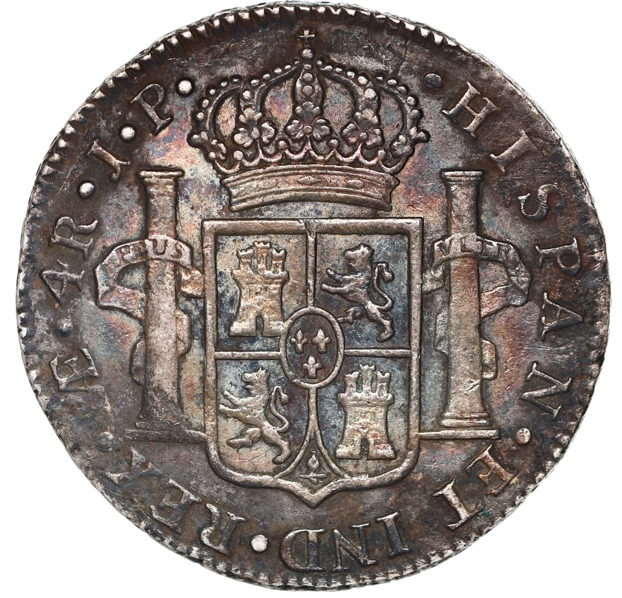 Lima, Peru, bust 4 reales, Ferdinand VII (imaginary bust), 1811 JP, rare. Cal-1064; KM-105.2. Bold AU- details with very deep, rich, uneven rainbow toning, parts of rims slightly crude, a few areas of light surface corrosion.