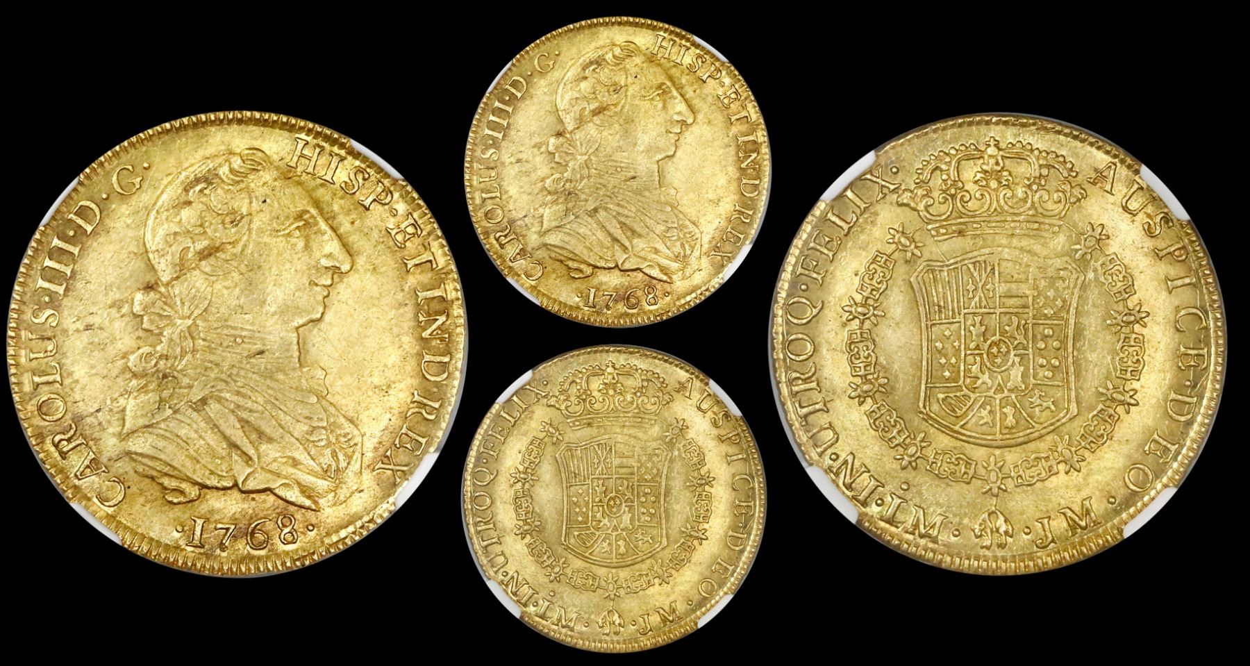 Lima, Peru, bust 8 escudos, Charles III (young bust), 1768JM, NGC AU 58. CT-16; KM-70. Good luster, choice reverse, also nice bust but with minor natural laminations on that side, rather attractive overall for this scarce early type. NGC #2828378-006.