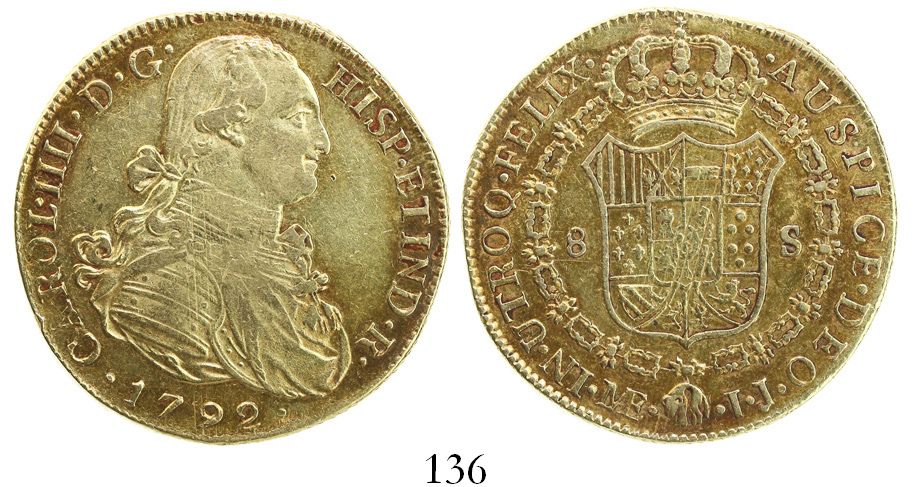 Lima, Peru, bust 8 escudos, Charles IV, 1792IJ.