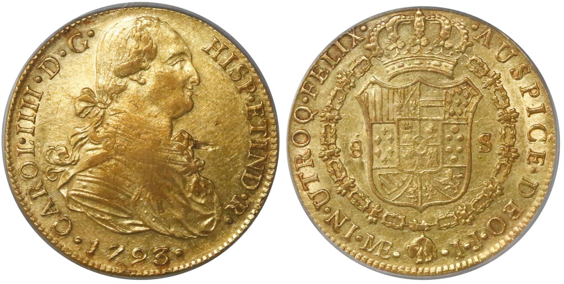 Lima, Peru, bust 8 escudos, Charles IV, 1793IJ, encapsulated PCGS AU 53. CT-10; KM-101. Nice luster, interesting red toning on high points, some hairlines on fields.