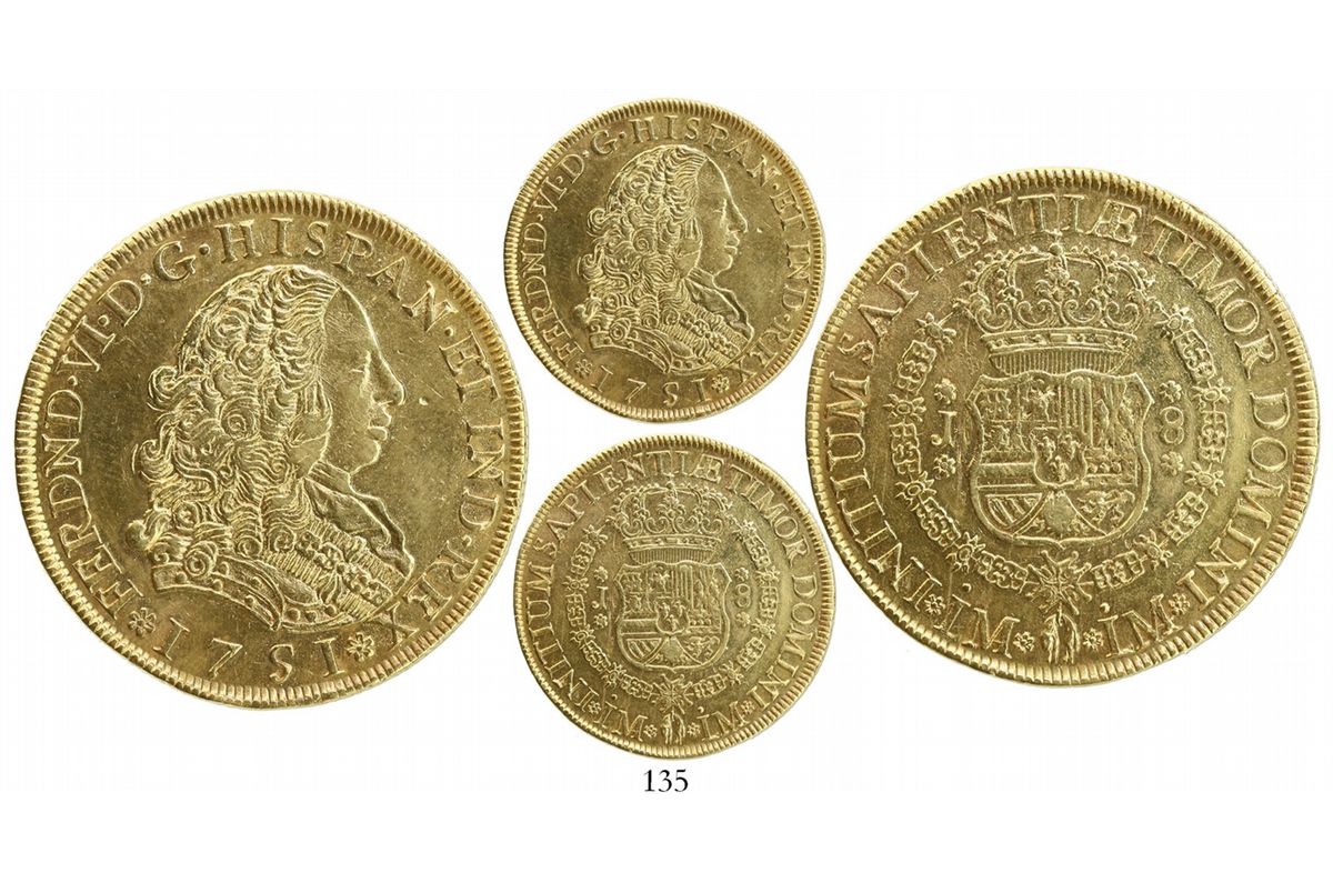 Lima, Peru, bust 8 escudos, Ferdinand VI, 1751J. CT-18; KM-50. 27.00 grams. AU details but lightly polished, bold strike, popular first type and also first date of issue.
