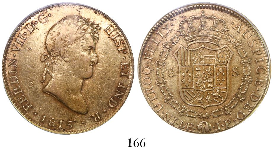 Lima, Peru, bust 8 escudos, Ferdinand VII, 1815JP, encapsulated NGC AU 50. CT-21; KM-129.1. Lightly red-toned with underlying luster, slightly grainy fields.