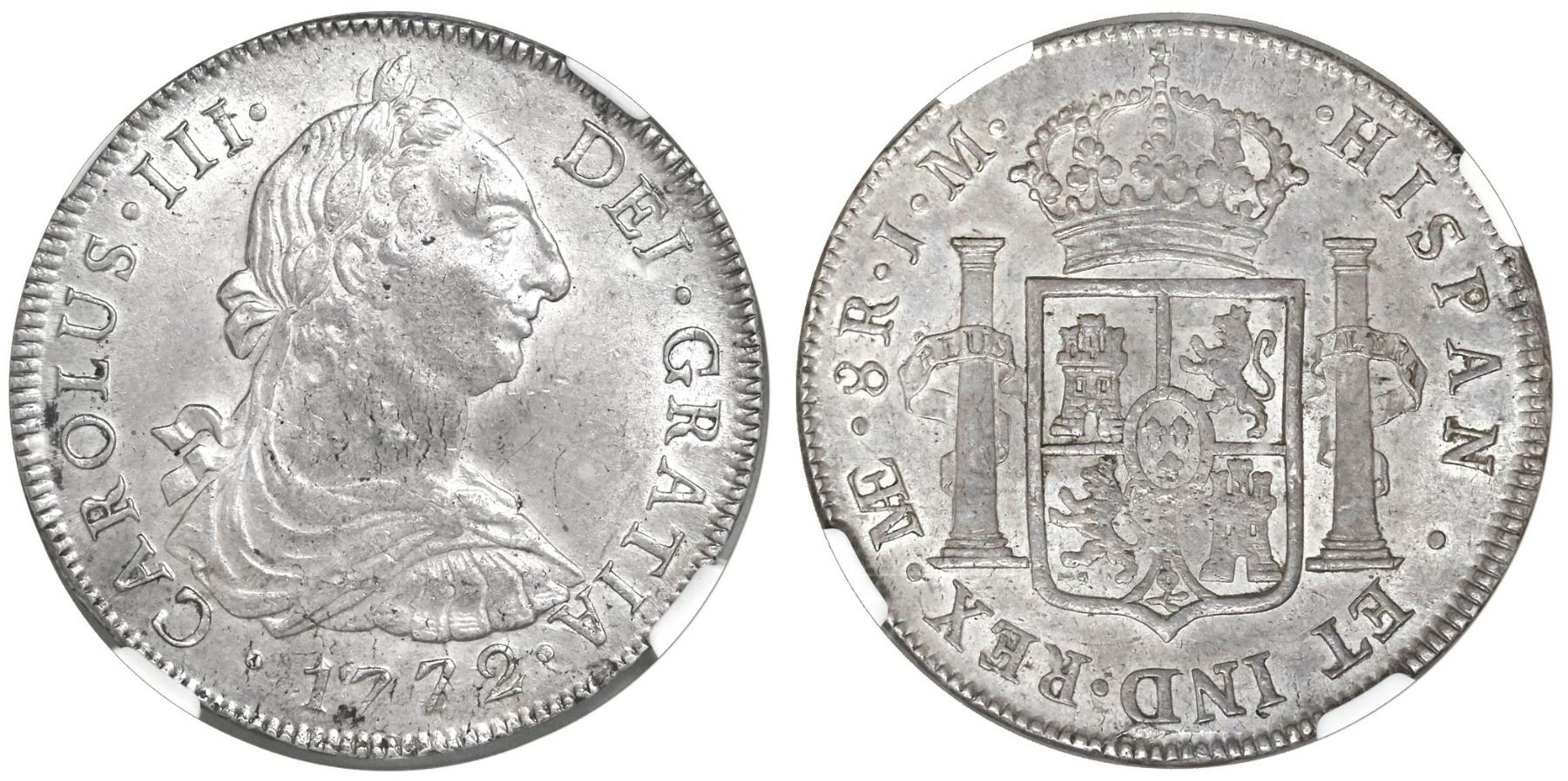 Lima, Peru, bust 8 reales, Charles III, 1772JM, NGC AU 55. KM-78; CT-851. Slight central weakness, muted luster, starting to tone. NGC #4274520-001.