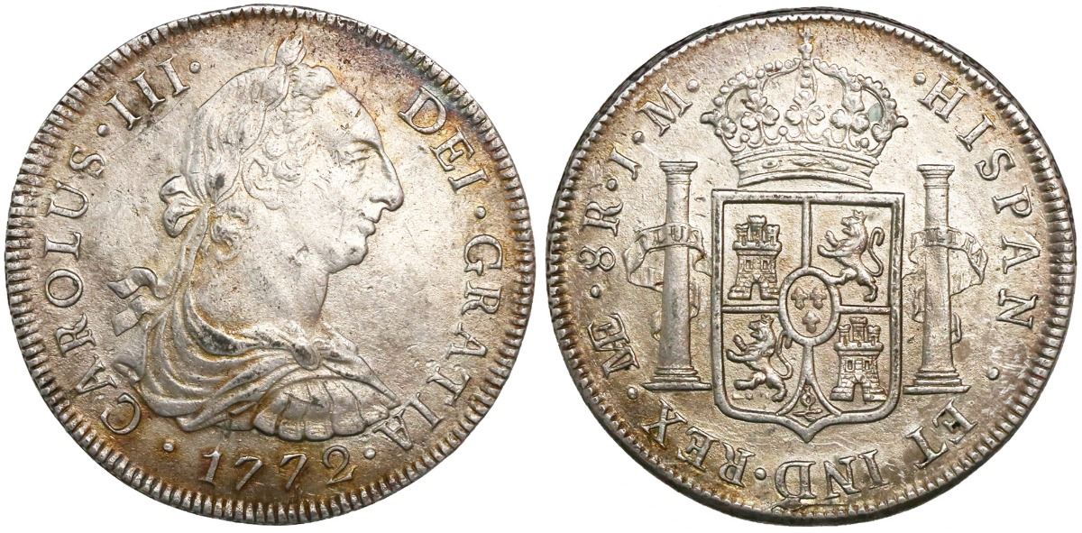 Lima, Peru, bust 8 reales, Charles III, 1772JM. CT-851; KM-78. 26.57 grams. XF+ with slightly porous surfaces, light scratch under III, lightly toned at rims, overall a nice example of the scarce first date of Lima busts.