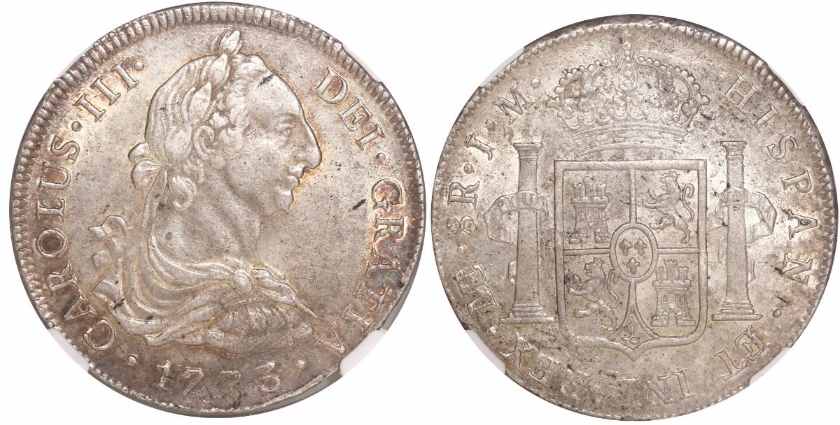 Lima, Peru, bust 8 reales, Charles III, 1773JM, encapsulated NGC AU 53. Nice luster and colorful toning in, also choice strike except for weak spot at rim below date.