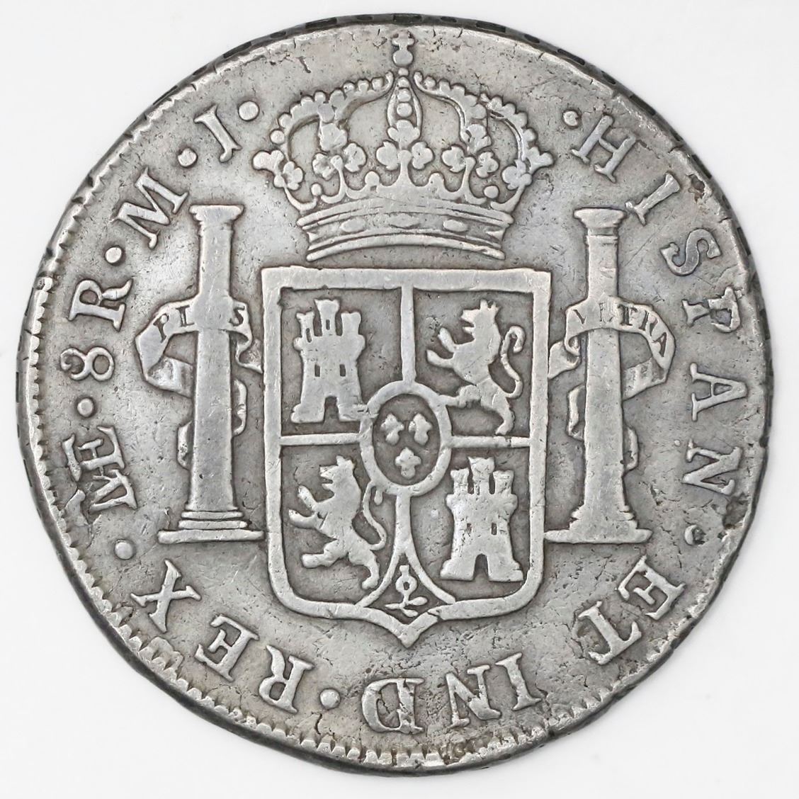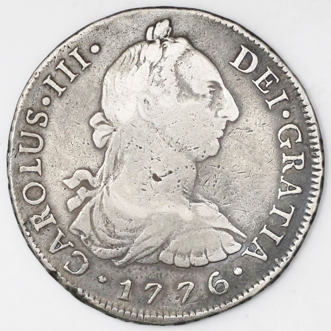 Lima, Peru, bust 8 reales, Charles III, 1776MJ. KM-78; CT-857. 26.49 grams. Fine, previously cleaned and now darkly rainbow toned over, popular as the date of US independence.