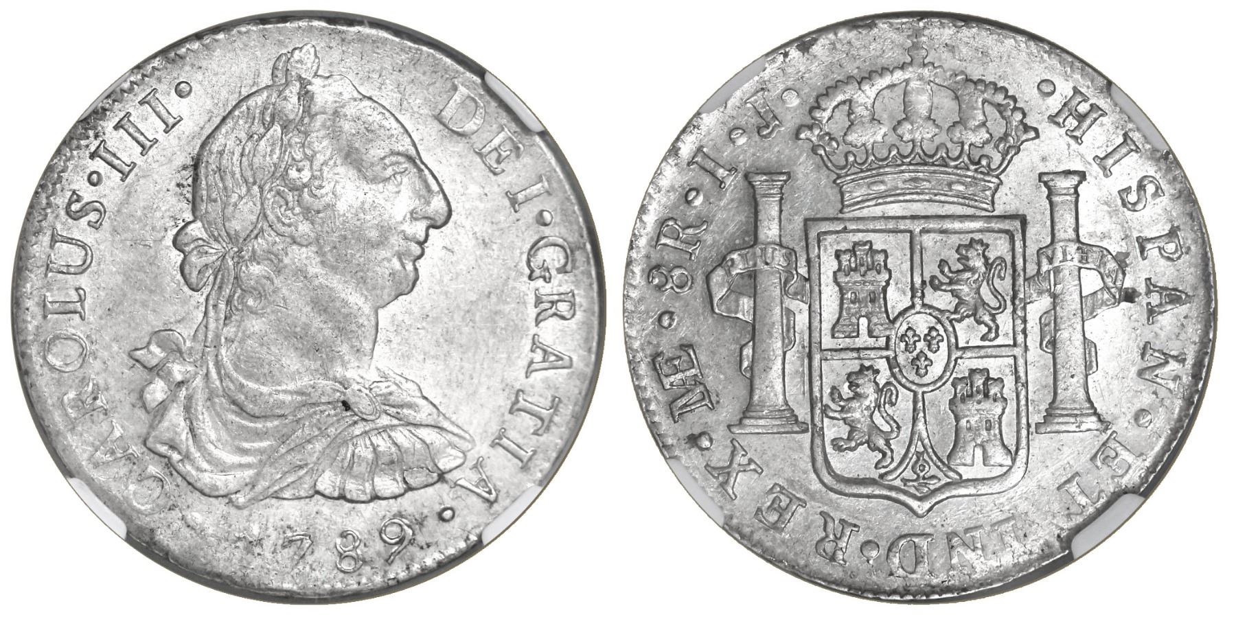 Lima, Peru, bust 8 reales, Charles III, 1789IJ, NGC AU 58. KM-78a; CT-874. Bold strike with choice luster but faint surface hairlines and parts of rims crude and weak, tied with three others for second finest in NGC census behind a single MS 61. NGC #4274525-006.