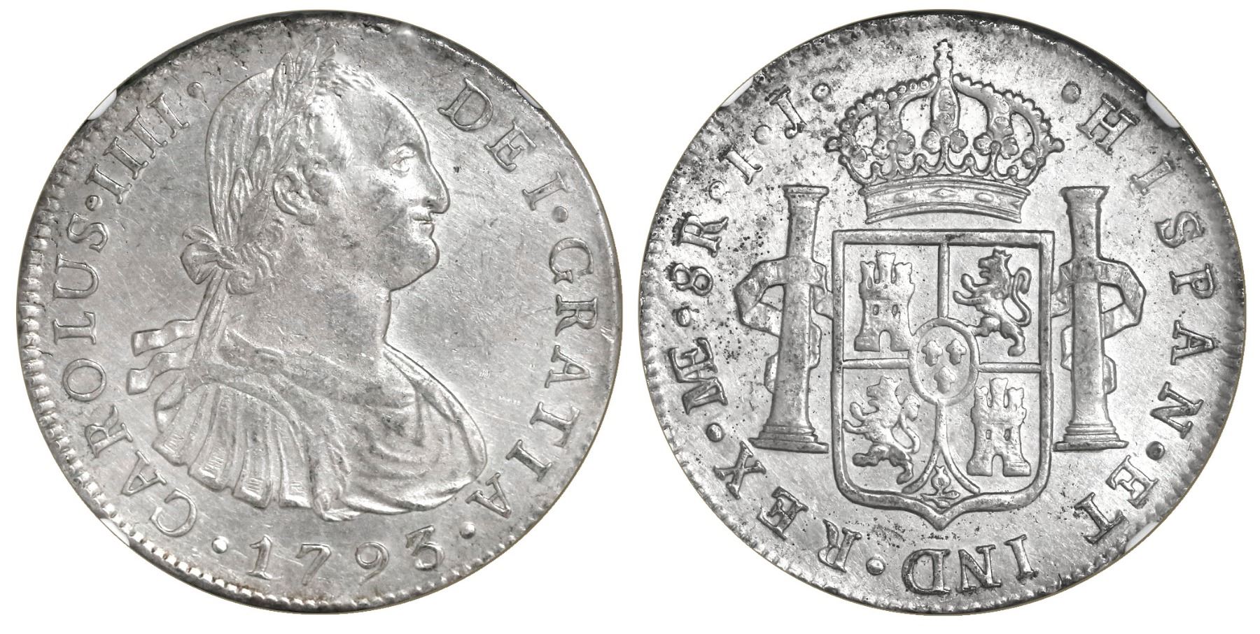 Lima, Peru, bust 8 reales, Charles IV, 1793IJ, NGC AU 58. KM-97; CT-647. Broad flan with well-detailed bust but high points on pillars side a bit soft, muted luster (no toning), still a relatively scarce grade (with no notable jump in MS population until 1798 at NGC). NGC #3641374-015.