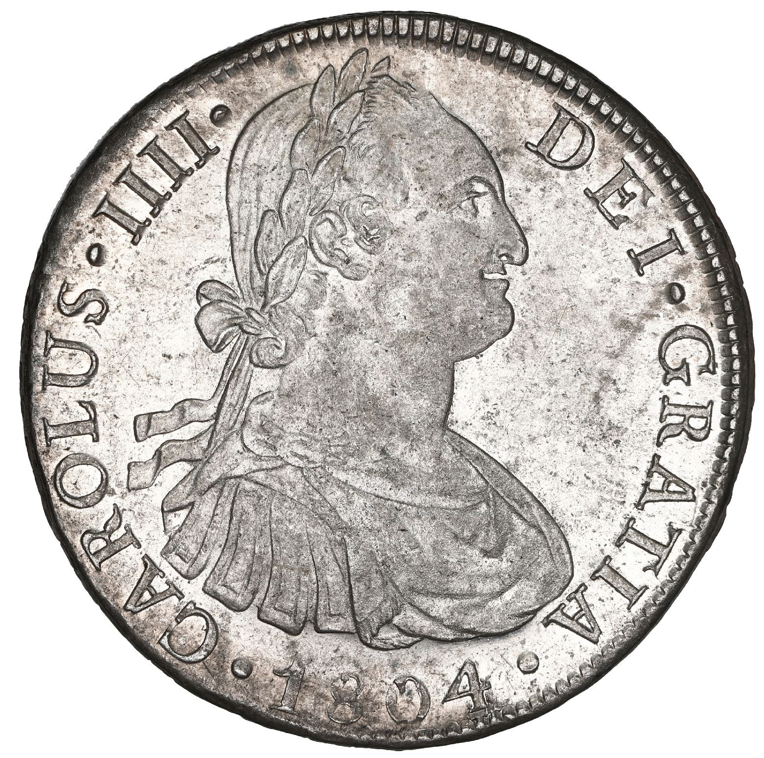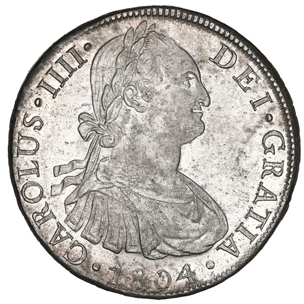 Lima, Peru, bust 8 reales, Charles IV, 1804 JP, NGC MS 63. Cal-924; KM-97. Broad and very slightly oval flan with bold strike and nice luster, small parts of rims weak or crude (as made), second highest grade in current NGC census. NGC #5965629-008.