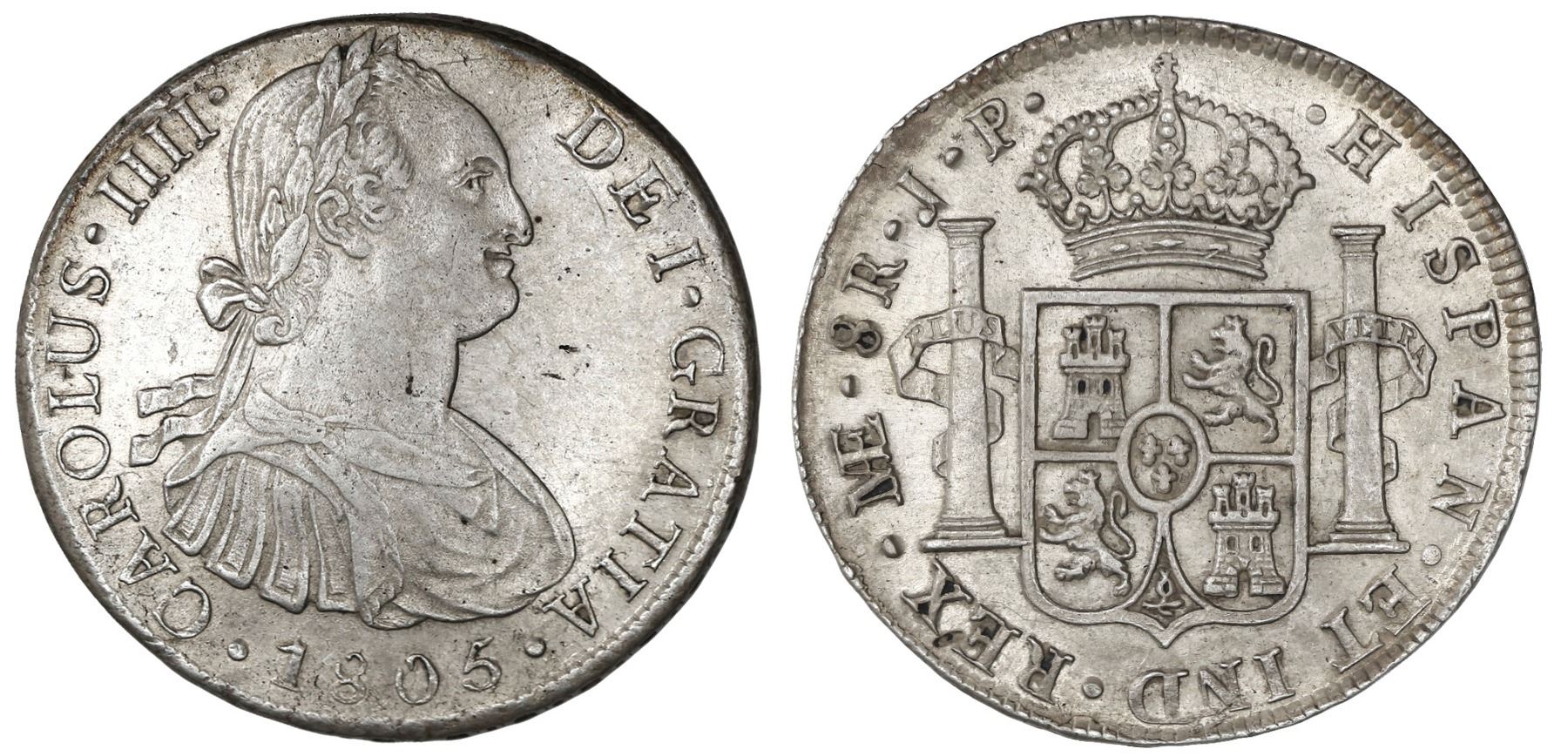 Lima, Peru, bust 8 reales, Charles IV, 1805JP. KM-97; CT-662. 27.12 grams. Lightly cleaned AU with muted luster, faint golden hue.