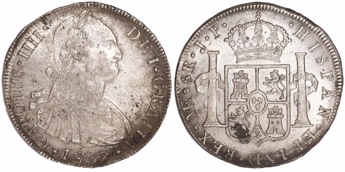 Lima, Peru, bust 8 reales, Charles IV, 1807JP. 26.89 grams. Lustrous AU/UNC with light surface hairlines on obverse only, parts of obverse rims crude (as made).