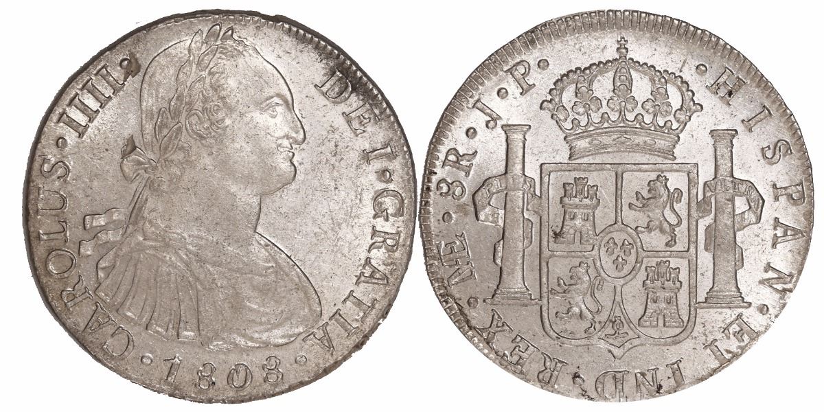 Lima, Peru, bust 8 reales, Charles IV, 1808JP. 26.04 grams. Highly lustrous UNC with light surface hairlines on obverse only, parts of rims crude (as made).