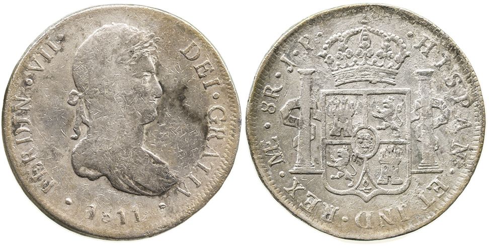 Lima, Peru, bust 8 reales, Ferdinand VII, 1811JP. KM-117.1; CT-477. 26.9 grams. Scarce first year of type, Fine+ with crude rims (as made) and surfaces (oxidation and marks), mostly lightly toned but some dark spots.