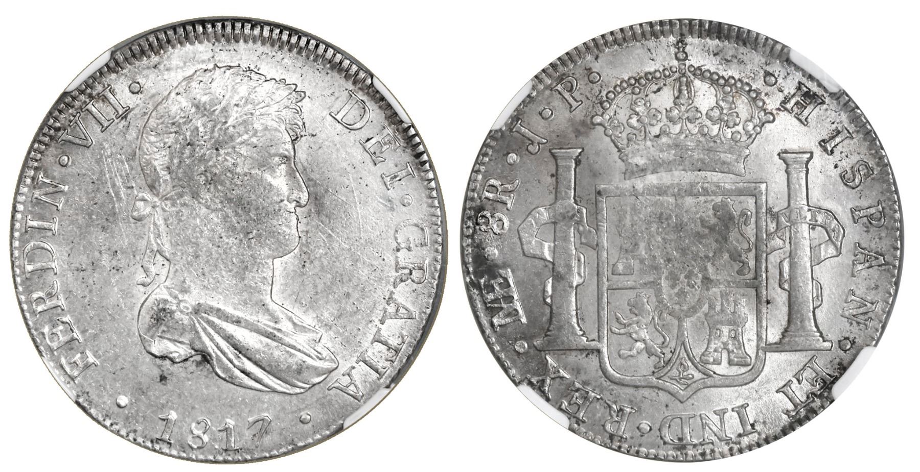 Lima, Peru, bust 8 reales, Ferdinand VII, 1817JP, wide date, NGC MS 61. KM-117.1; CT-485. Lustrous and starting to tone, centers weak, slightly off-center obverse. NGC #4092364-016.