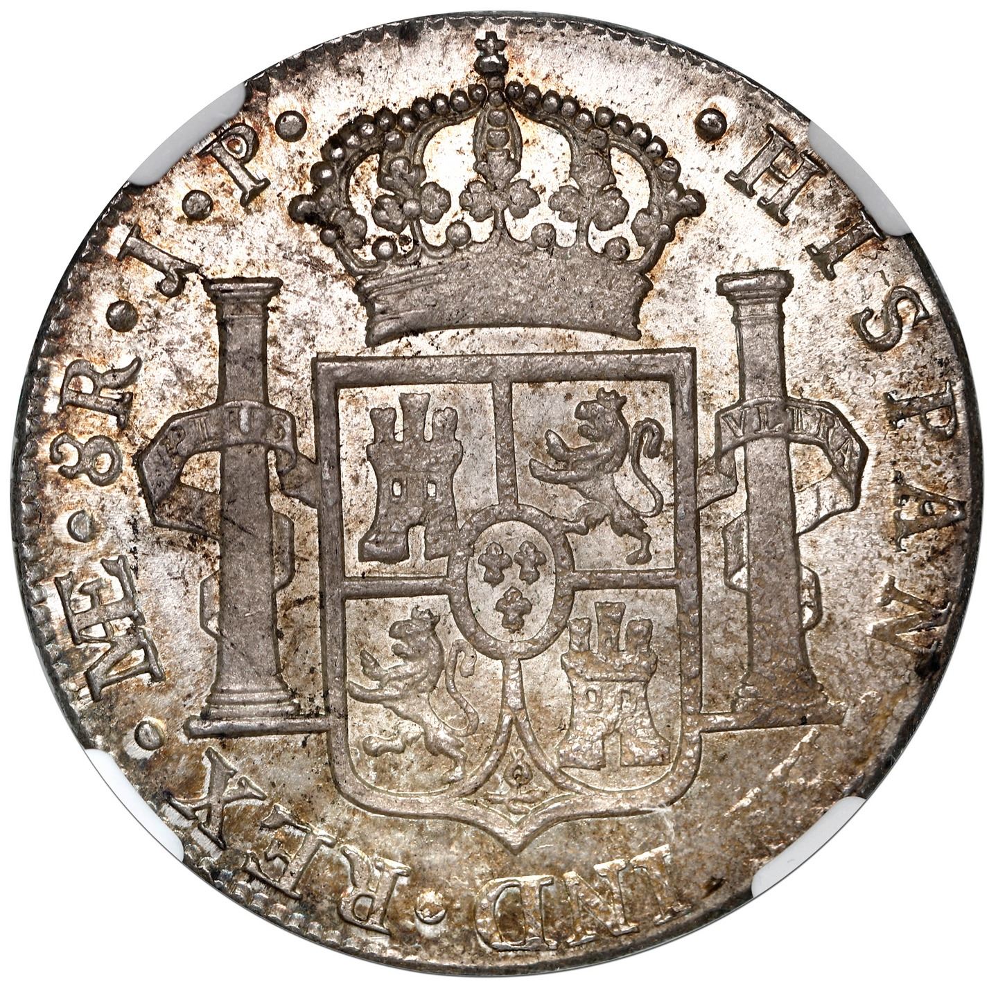Lima, Peru, bust 8 reales, Ferdinand VII 1820 JP, NGC MS 63. Cal-1074; KM-117.1. Frosty with luster and mostly full details (weak in parts of legends), incipient rainbow toning.