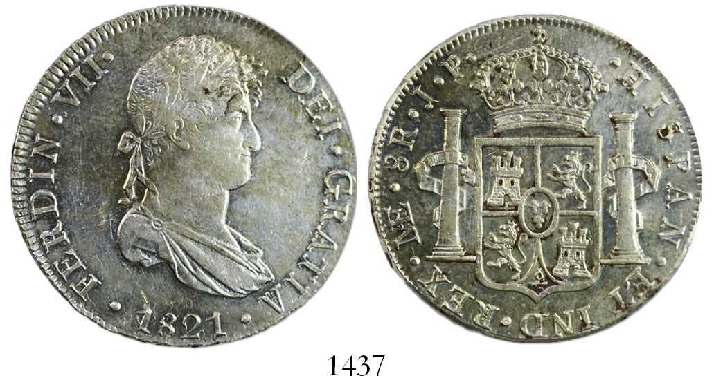 Lima, Peru, bust 8 reales, Ferdinand VII, 1821JP. KM-117.1; CT-489. 26.79 grams. Lustrous UNC but lightly cleaned, slightly off-center strike, light golden toning all over.