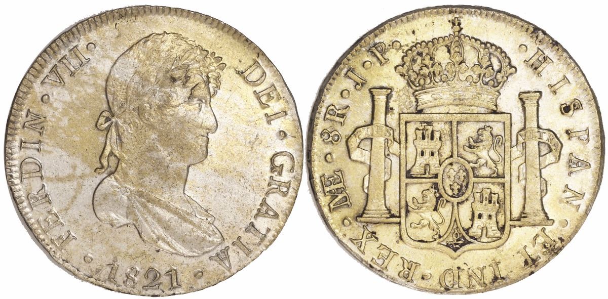 Lima, Peru, bust 8 reales, Ferdinand VII, 1821JP. 26.79 grams. AU+ with muted luster under splashes of golden toning, nice strike.