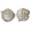 Lima, Peru, cob 1/2 real, 1701H, Charles II posthumous. S-L15; KM-22; CT-802. 0.98 gram. Bold full monogram and cross, the former with clear assayer and date and mintmark surrounding, toned XF with minor pitting but no outright corrosion (thin and underweight flan), somewhat scarce for this mint.