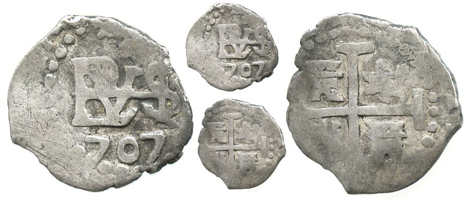 Lima, Peru, cob 1/2 real, 1707. S-L17; KM-30; CT-1756. 1.6 grams. Bold full monogram and date, full but fainter cross-lions-castles, toned all over, Fine+.