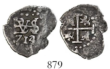 Lima, Peru, cob 1/2 real, 1714/3. S-L20. 1.74 grams. Broad, odd-shaped flan with choice full central details (monogram, date and cross), richly toned VF+.