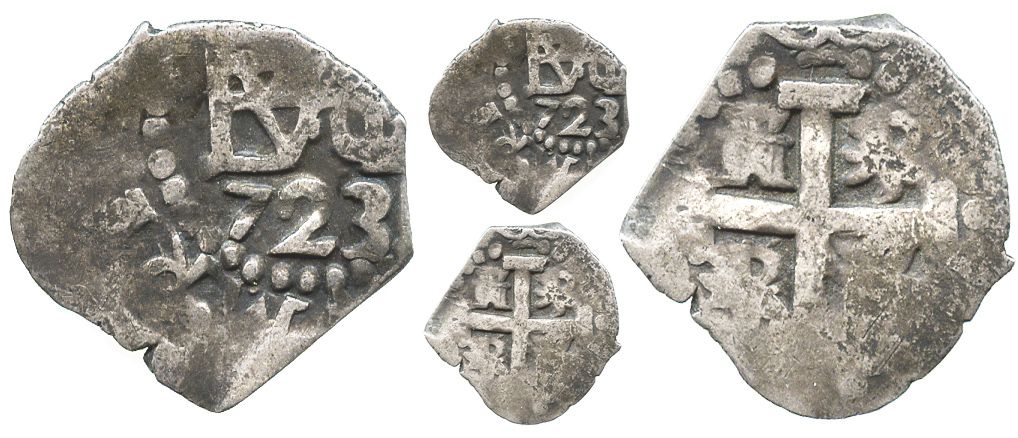 Lima, Peru, cob 1/2 real, 1723. S-L20; KM-30; CT-1772. 1.3 grams. Bold full date below off-center monogram, nearly full cross, broad flan but much flatness, nicely toned Fine+.