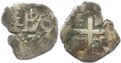 Lima, Peru, cob 1/2 real, 1734. S-L21; KM-30a; CT-1780.. 1.4 grams.Full monogram with mintmark to left, full date, toned, salvaged Fine.