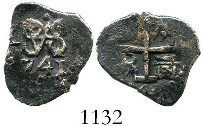 Lima, Peru, cob 1/2 real, 1741(V). S-L22; KM-30a. 1.5 grams. Very bold full monogram and date and cross but flat and crude peripheries, deeply toned VF+ with orange encrustation.