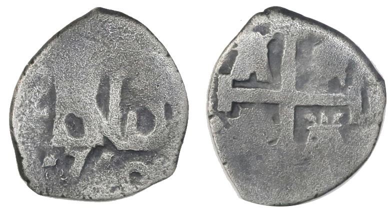 Lima, Peru, cob 1/2 real, 1750(R). S-L23; KM-41; CT-633. 1.45 grams. Nearly full monogram with clear mintmark to left and date below, most of cross, lightly toned and thin but not overly corroded, very rare provenance and especially rare denomination as from a shipwreck. With photo-certificate from the salvagers. Recovered from: Santa Leocadia, sunk in 1800 off Punta Santa Elena, Ecuador