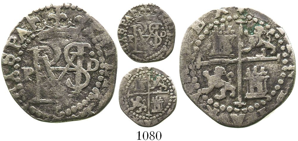 Lima, Peru, cob 1/2 real, Philip II, assayer Diego de la Torre, P to left and dot-D to right of monogram. S-L4. 1.3 grams. Bold full detail on both sides, including crown but only partial legends (small flan), slightly doubled monogram, AVF with slight surface porosity.