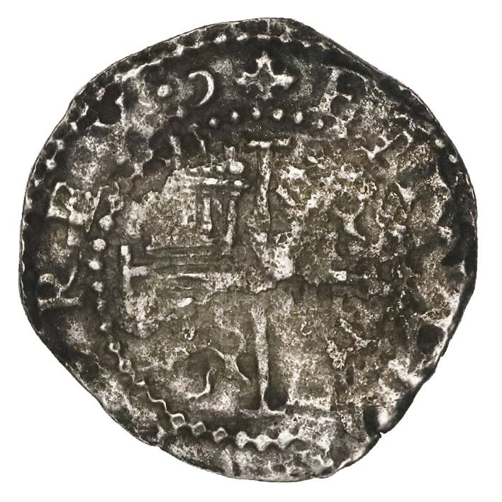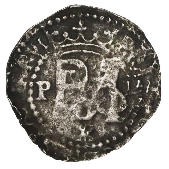 Lima, Peru, cob 1/2 real, Philip II, assayer Diego de la Torre, P to left, oD to right, V/A (makeshift star) at bottom, rare. S-L4; KM-unl (5 for type). 0.82 gram. Rare type struck on a broad thin planchet with some surface corrosion, XF details overall with nearly complete monogram and some legend showing. Pedigreed to the Arturo Rosenheim collection.