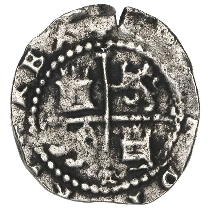 Lima, Peru, cob 1/2 real, Philip II, assayer Diego de la Torre, dot-D to left, * to right. S-L4; KM-unl (5 for type); Cal-120. 1.38 grams. VF with minor surface corrosion, full monogram and clear assayer's initial, almost complete cross.