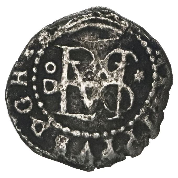 Lima, Peru, cob 1/2 real, Philip II, assayer Diego de la Torre, oD to left, * to right. S-L4; KM-unl (5 for type); Cal-120. 1.28 grams. Corroded VF with full monogram and partial legends, nearly complete cross, dark toning in fields. Pedigreed to the Arturo Rosenheim collection.