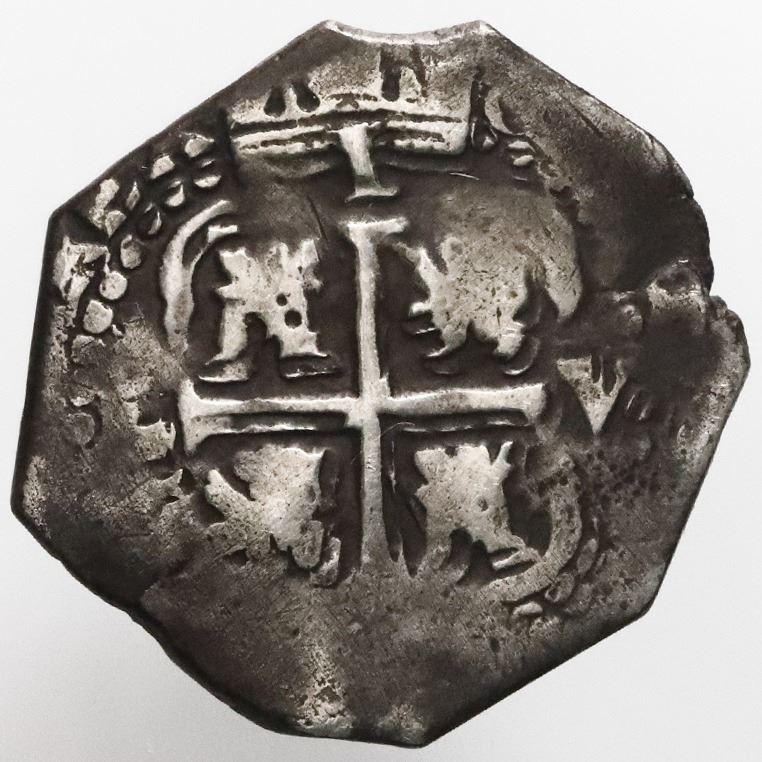 Lima, Peru, cob 1 real, 1684V. S-L6; KM-20; Cal-213. 2.84 grams. Fine with full pillars and cross, some hairlines, darkly toned fields, first date of Lima pillars-and-waves coinage. Pedigreed to the Arturo Rosenheim collection.