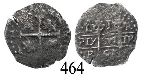 Lima, Peru, cob 1 real, 1691R. S-L9. 2.3 grams. Nice round flan with full and well-centered cross and pillars, 2 mintmarks, 3 assayers, nicely toned but corroded all over. Recovered from: Spanish 1715 Fleet, east coast of Florida. With Cobb Coin Co. (Fisher) certificate #16766.