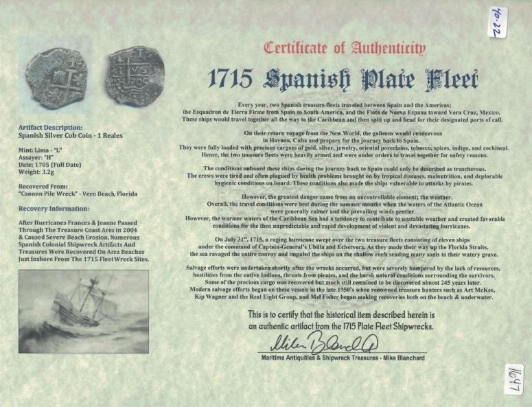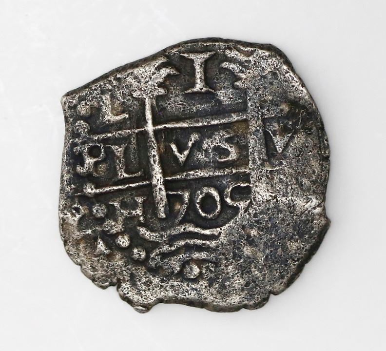 Lima, Peru, cob 1 real, 1705H. S-L15a; KM-31; CT-1478. 3.18 grams. Well struck and detailed with almost no corrosion, nearly complete pillars and shield, darkly toned all over. From the "Cannon Pile" site, with photo-certificate from the salvager. Recovered from: Spanish 1715 Fleet, east coast of Florida