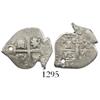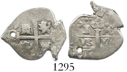 Lima, Peru, cob 1 real, 1717M, cut into a heart shape contemporaneously. S-L20; KM-31; CT-1495. 3.1 grams. Nice full cross, bold VF details, neat shape with hole at point. Pedigreed to the Roberto Mastalir collection of Lima silver cobs.