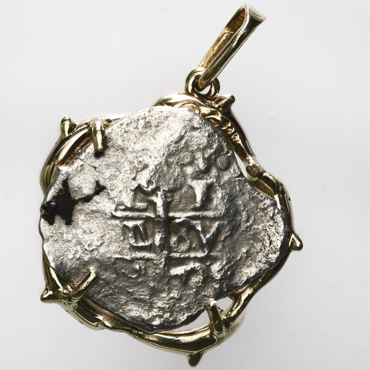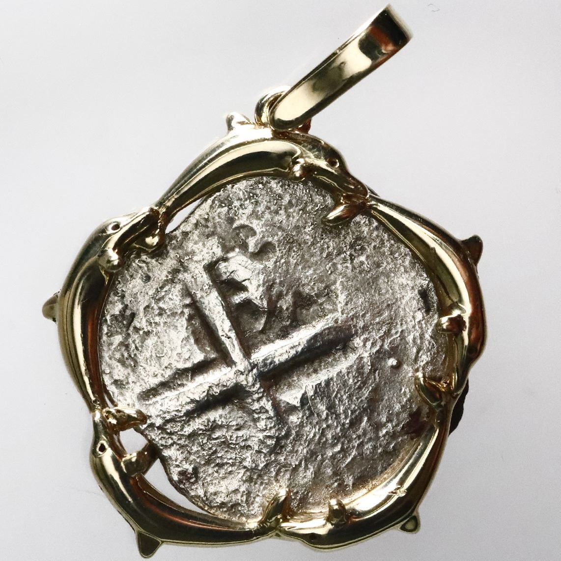 Lima, Peru, cob 1 real, 1731(?)(M), ex-Princess Louisa (1743), mounted cross-side out in 14K gold bezel (five dolphins) with swivel bail. 6.40 grams total. VF coin with much peripheral flatness but good centers, partial date with clear 73 (certificate attributes to 1725 in error), silvery from cleaning, unique mounting made of five dolphin findings linked head-to-tail. From the Princess Louisa (1743), with photo-certificate.