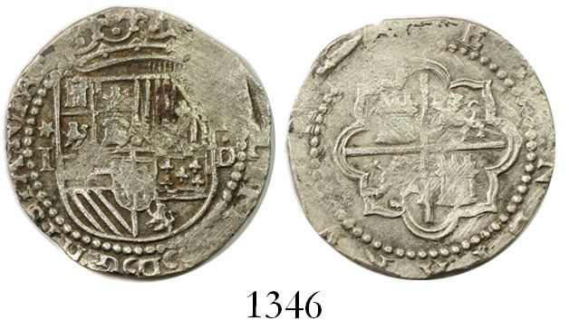 Lima, Peru, cob 1 real, Philip II, assayer Diego de la Torre, *-I to left, P-dot-D to right. S-L4; KM-7 ;CT-634. 3.26 grams. AXF with sharp details (weak centers), traces of porosity, toned in crevices.