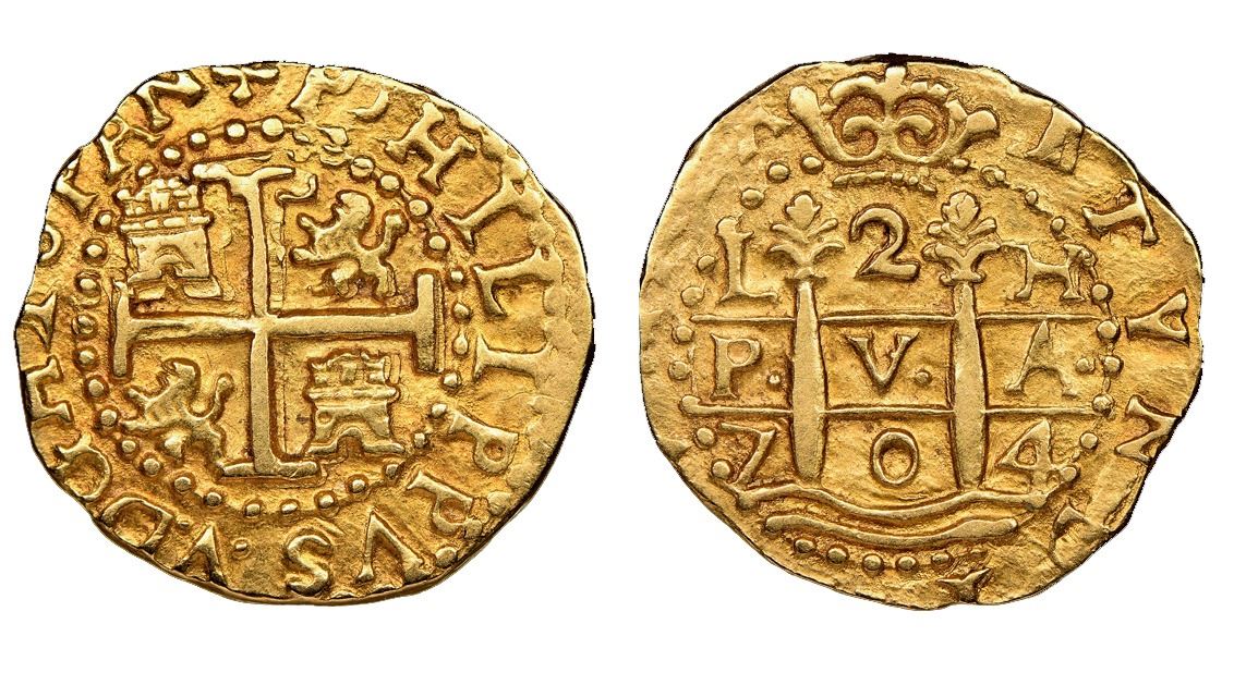 Lima, Peru, cob 2 escudos, 1704H, rare, NGC AU 58, ex-1715 Fleet (designated on special label), finest and only example in NGC census. S-L25a; KM-36; Cal-1821. 6.63 grams. Broad flan with bold full details (especially the crown and cross-lions-castles) enhanced with deep red toning, minor high-point wear. NGC #4762817-001. From the 1715 Fleet.