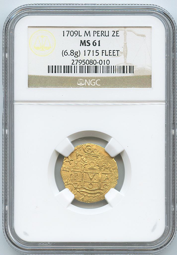 Lima, Peru, cob 2 escudos, 1709M, from the 1715 Fleet, encapsulated NGC MS 61.
