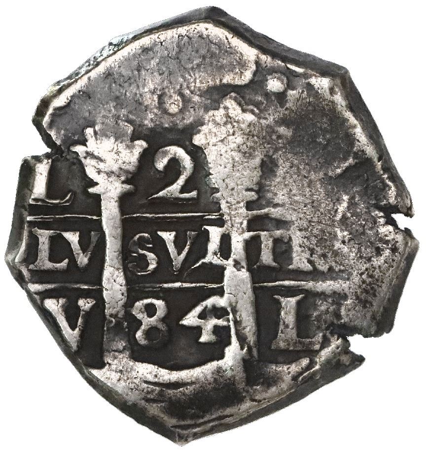 Lima, Peru, cob 2 reales, 1684V. S-L6; KM-21; Cal-341. 6.56 grams. Exceptionally choice full cross-lions-castles, full but cruder pillars with bold date and assayer and both mintmarks, VF with deeply toned fields, first date of issue. Pedigreed to the Arturo Rosenheim collection.